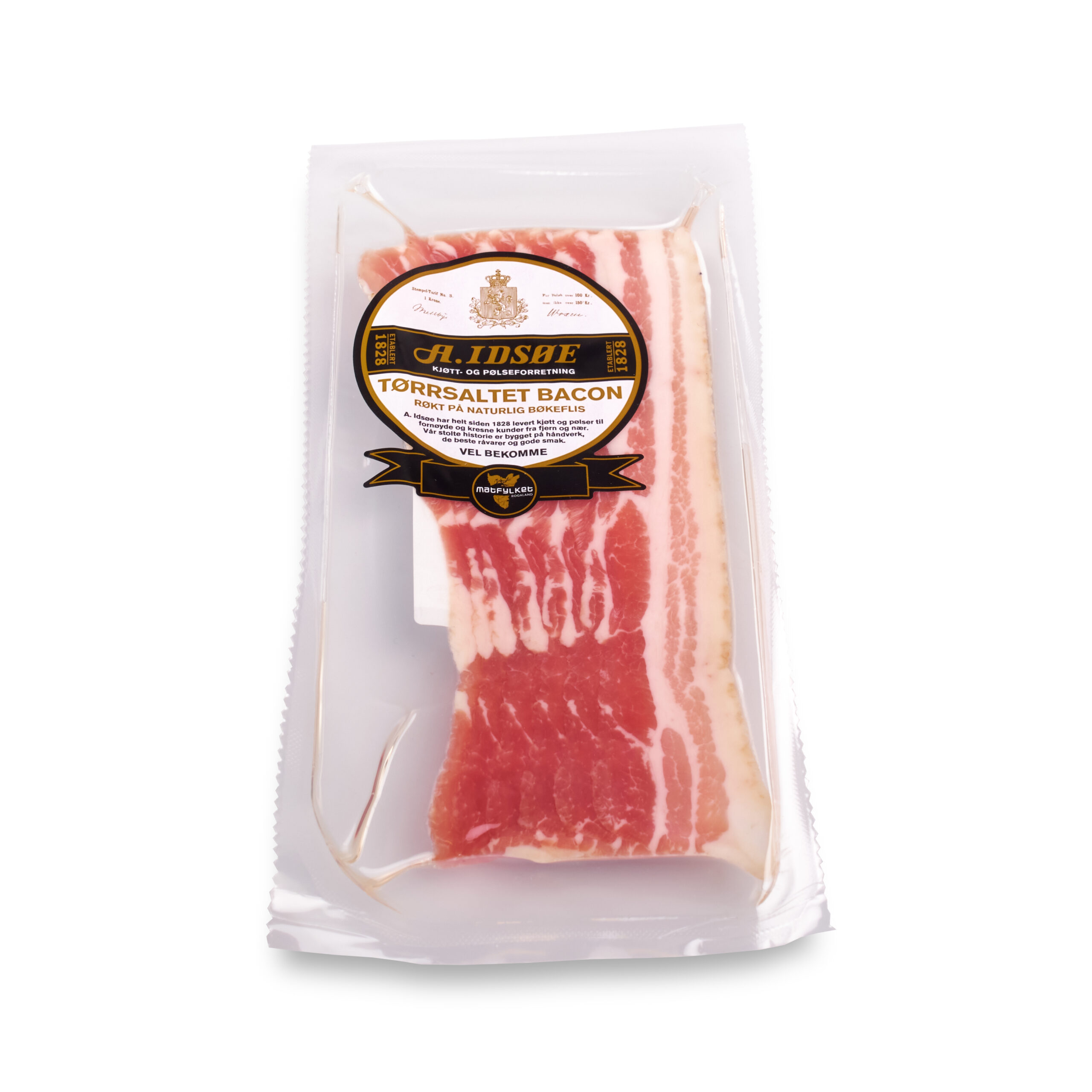 Siden 1968 har vi laget bacon på vår måte – og den holder vi fast ved. Det begynner med tørrsalting i rikelig med salt før modning. Til slutt varmrøykes det på bøkeflis, som gir den gode smaken.
