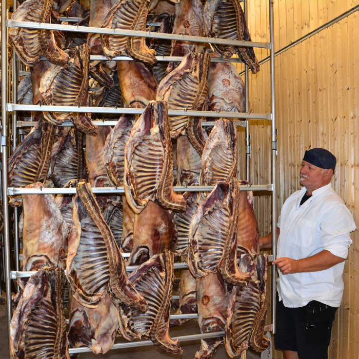 Å lage godt pinnekjøtt krever erfaring, presisjon og respekt for råvaren. Vi starter med lam av høy kvalitet fra Jæren, nøye sortert for hånd. Kjøttet tørrsaltes med tre ulike typer salt, før det tørkes sakte og kontrollert – helt uten snarveier. Hvert stykke er forskjellig, og det krever kunnskap å vite når det er klart. Den kunnskapen har vi opparbeidet oss over mange år.