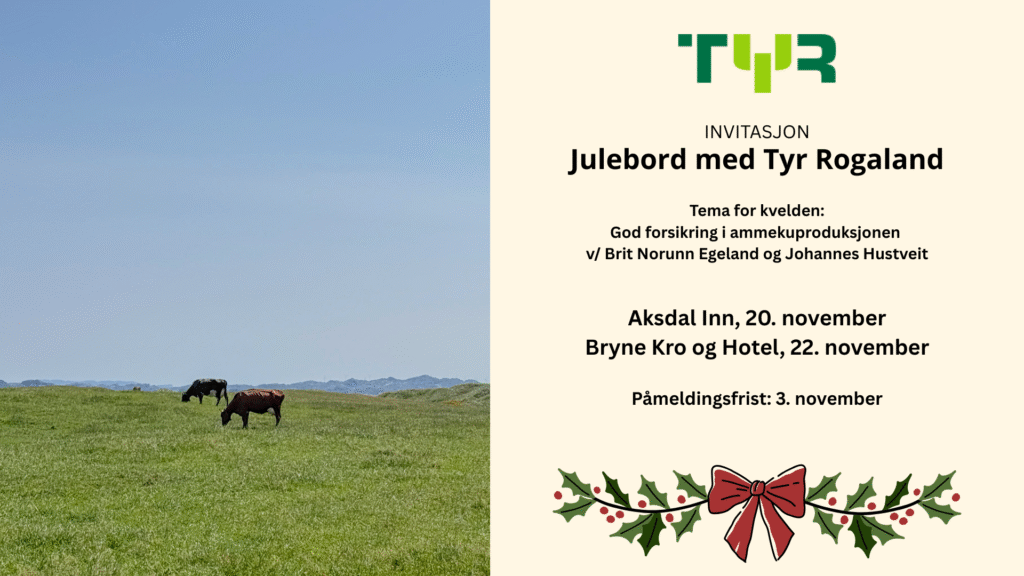 Velkommen til julebord med Tyr Rogaland. Tema for kvelden er: God forsikring i ammekuproduksjonen v/ Brit Norunn Egeland og Johannes Hustveit fra Sparebanken 1 Sør Norge Påmeldingfrist innen 3.nov Det blir servering av god norsk julemat 300 kr per pers. Aksdal Inn,...